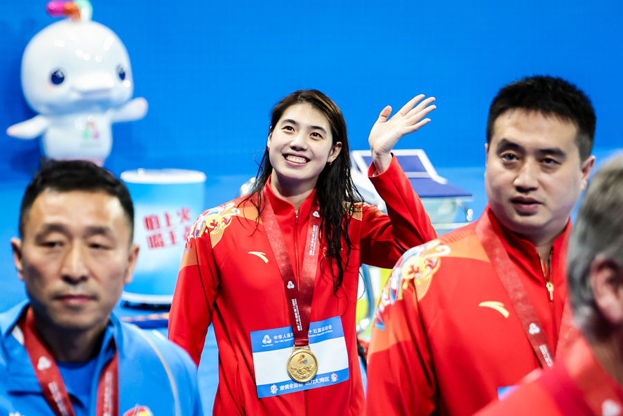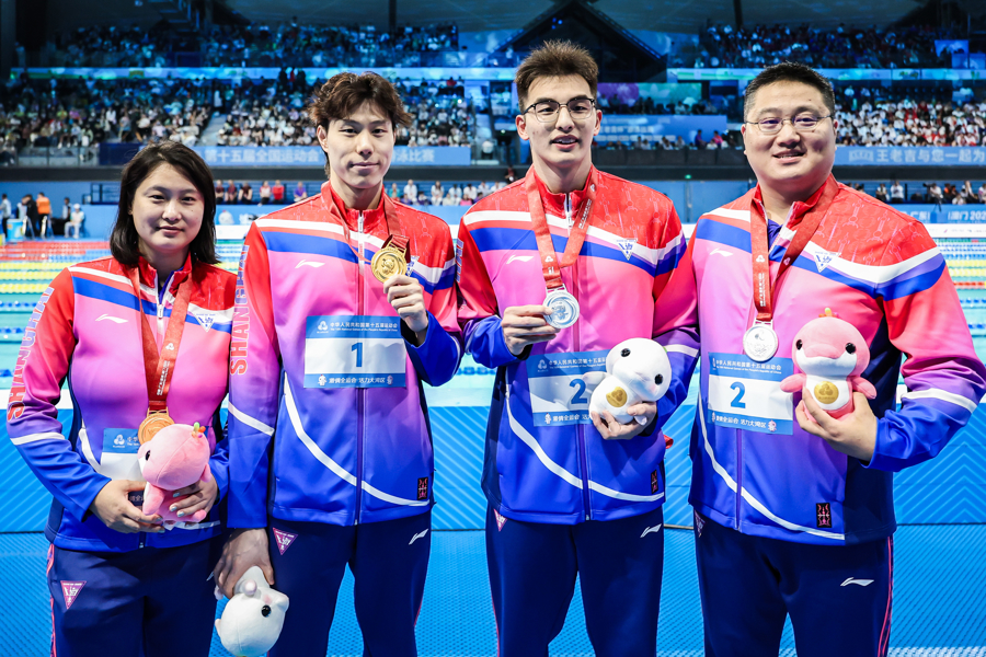 11月11日晚,深圳大运中心游泳馆星光熠熠。上海选手覃海洋以58秒98的成绩夺得男子100米蛙泳冠军,收获个人在该项目的全运会首金,郑英昊、闫子贝分获银牌和铜牌。过去两届全运会,覃海洋共收获2金3银3铜,但在100米蛙泳项目上仅取得1银1铜,这次夺冠是他的一个小小突破。